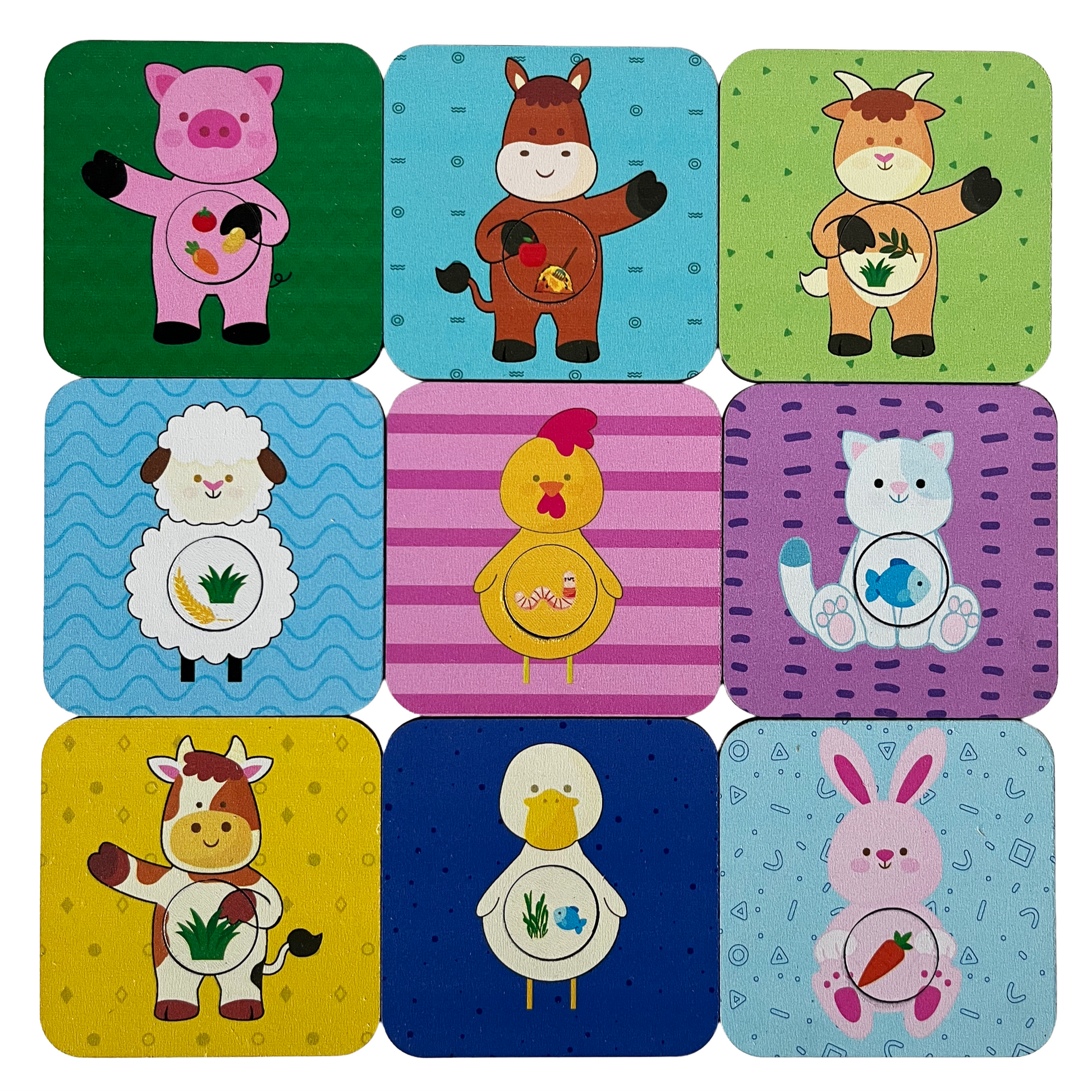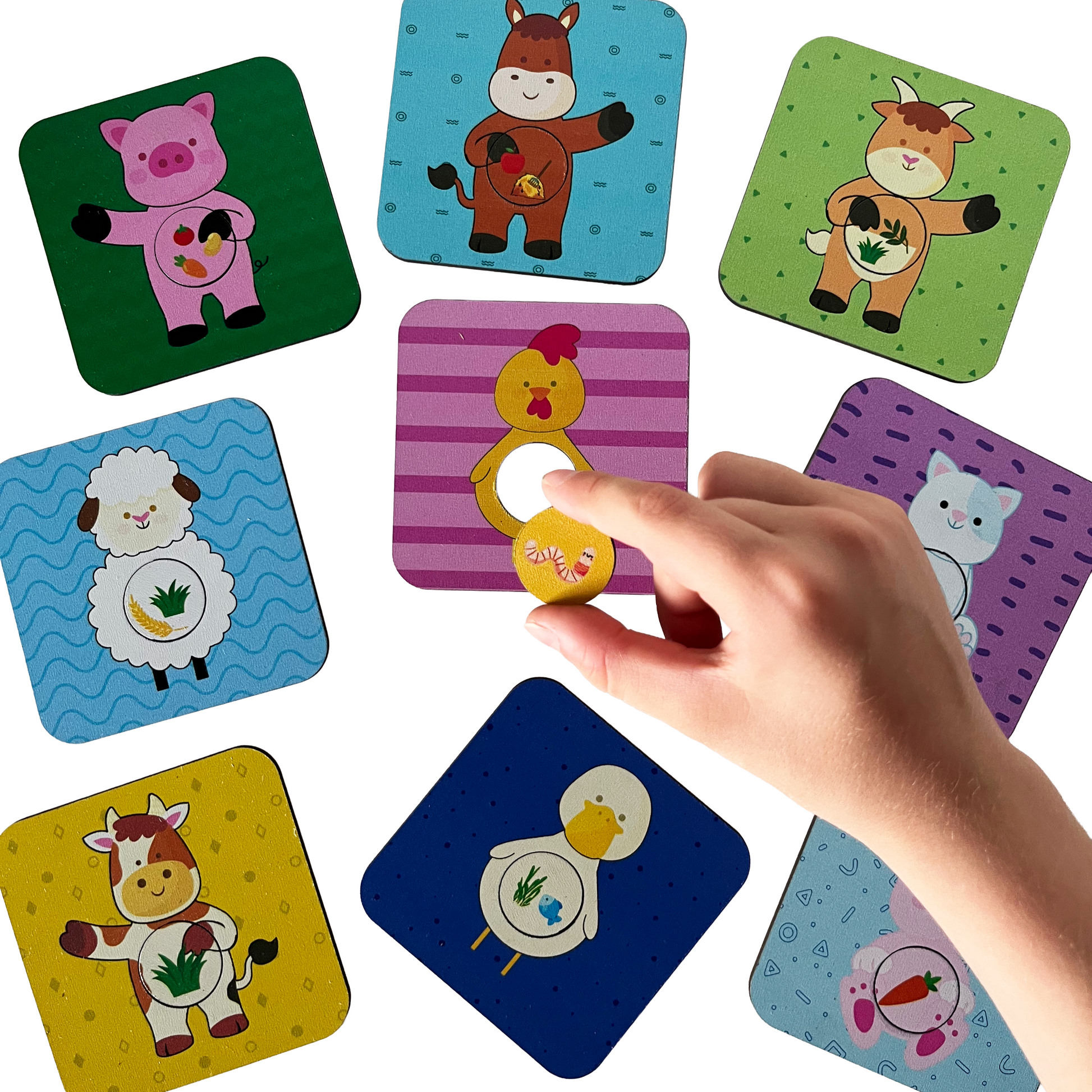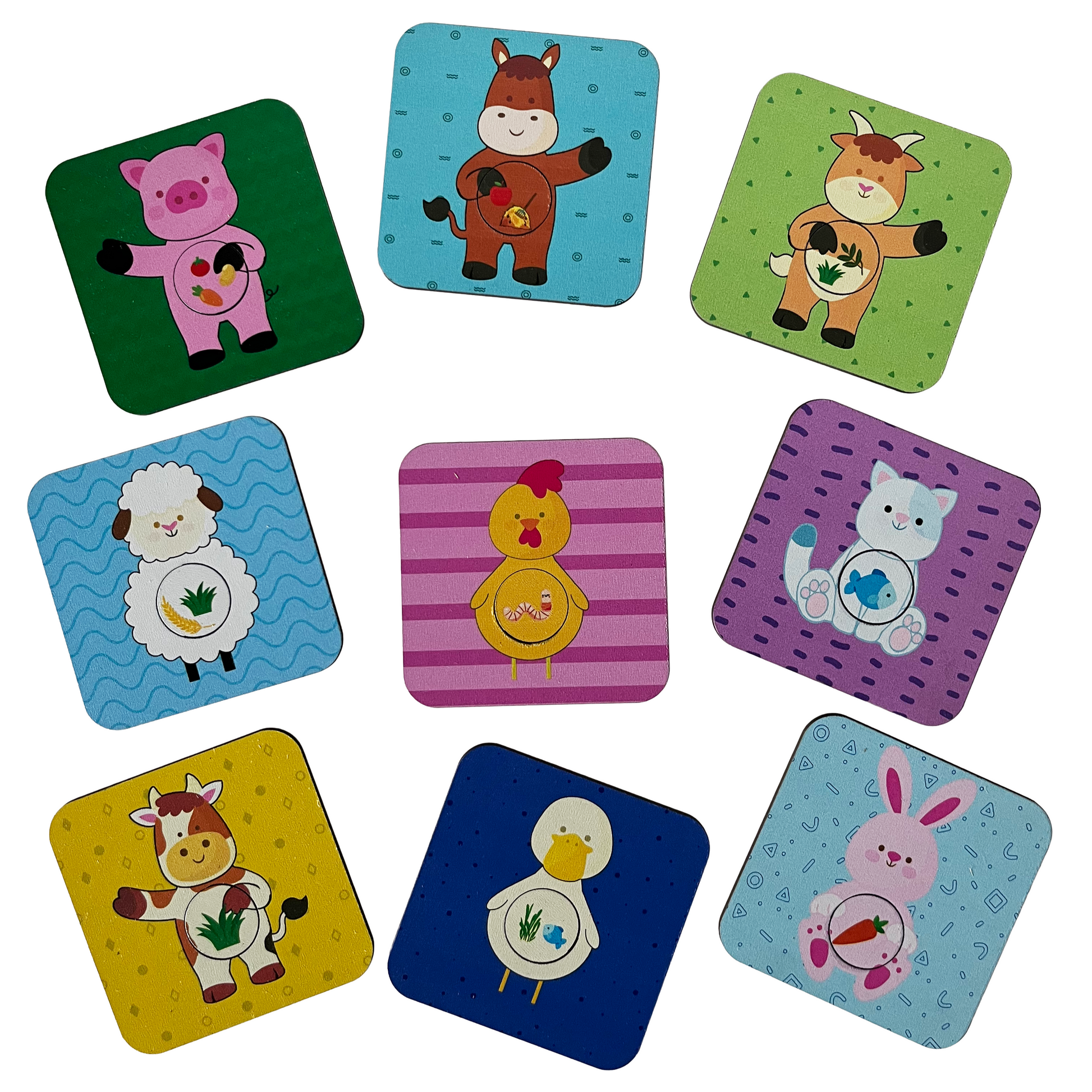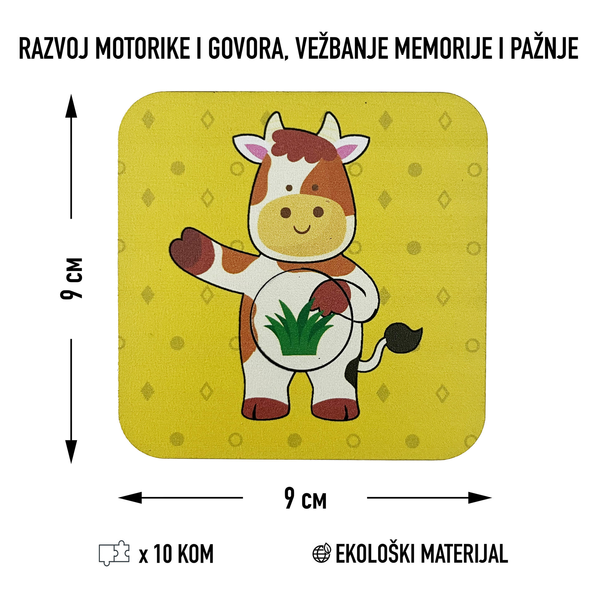 Slagalica sadrži 9 pažljivo osmišljenih parova sa ilustracijama životinja i njihove omiljene hrane. Svaki deo je dimenzije 9 x 9 cm – idealan za male dečje ruke i laka za rukovanje.