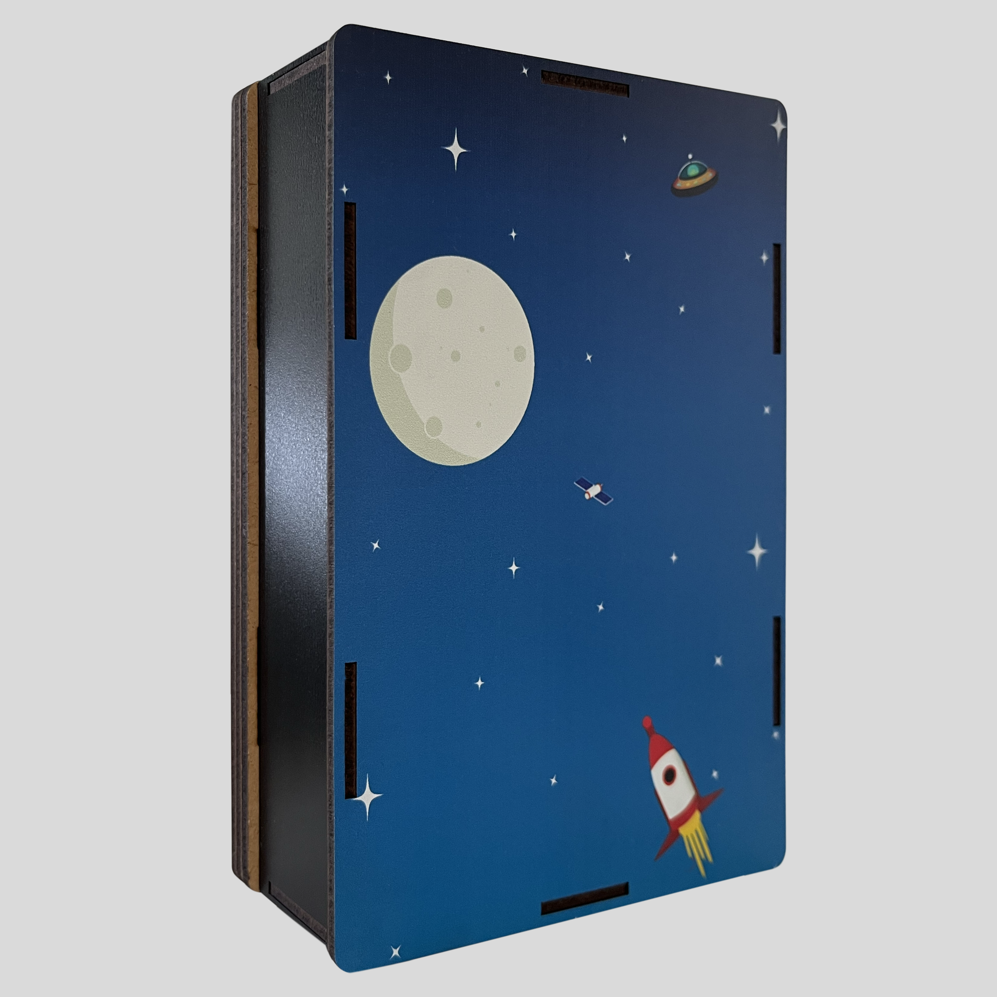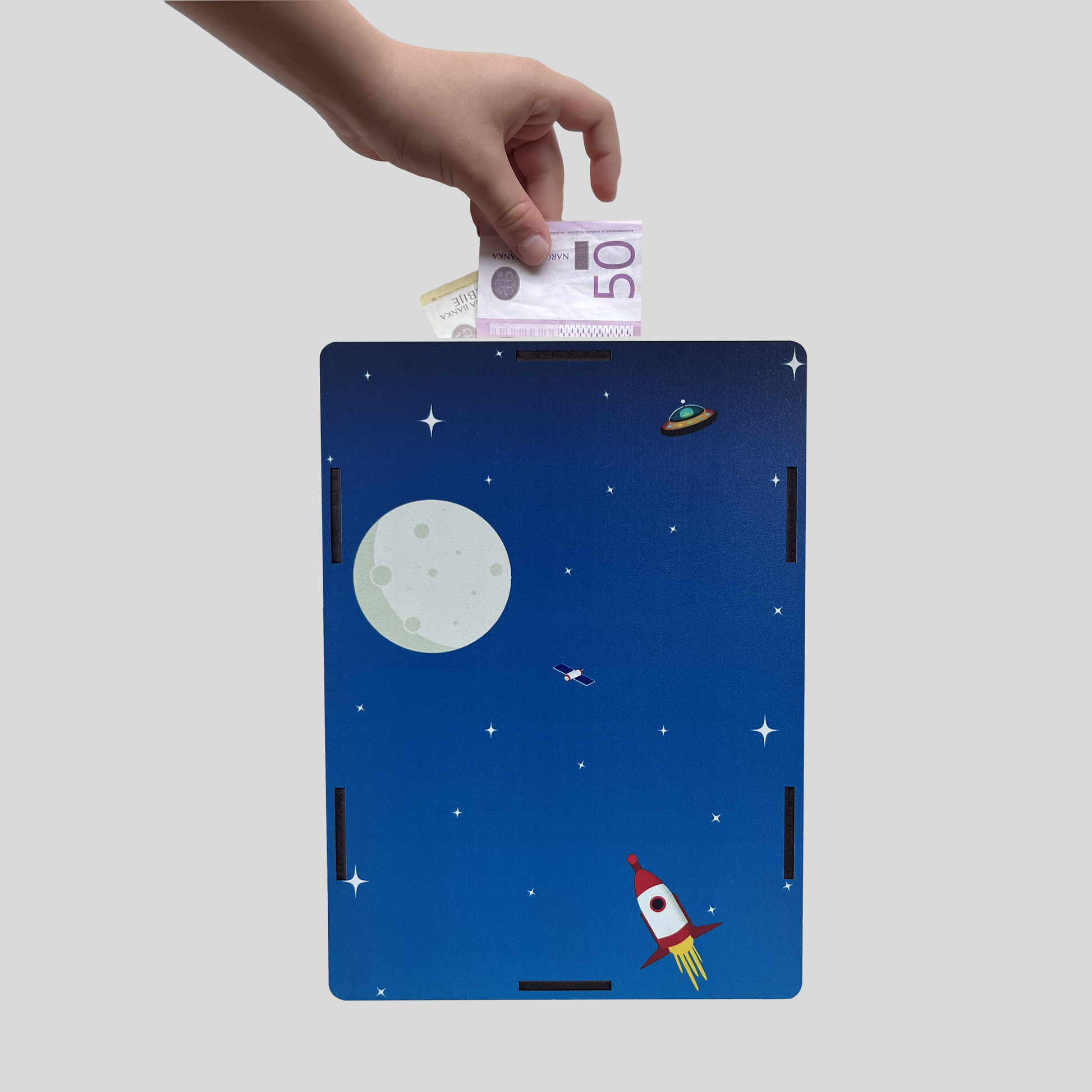 Uz ovu čarobnu kasicu deca mogu da uče kako da štede, dok maštaju o putovanjima kroz galaksije. Svaki ubačeni iznos se precrta, a tri promenljiva iznosa omogućavaju deci da sama biraju za šta će da štede. Karakteristike: Promenljivi iznosi - lako se prilagodjavaju Izradjen od drveta- bezbedna, dugotrajna i dekorativna Idealna za poklon