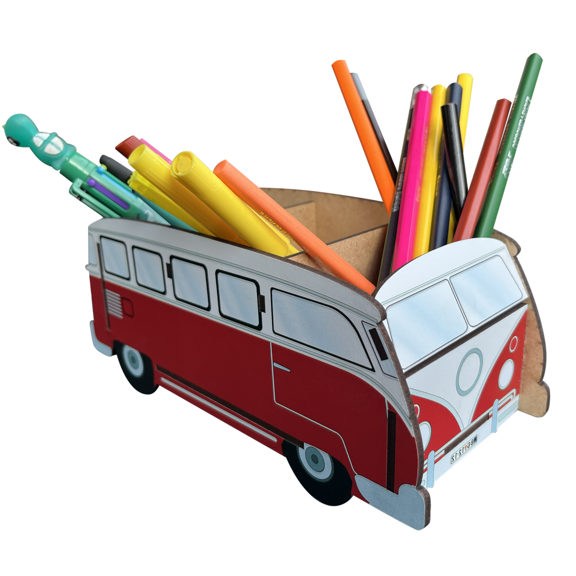 Organizator za olovke "MINI VAN" od drveta je zanimljiv i praktičan dodatak za svaki sto. Ručno izrađen u Srbiji, sa srpskim tablicama i retro dizajnom, privlači pažnju i unosi toplinu u prostor.